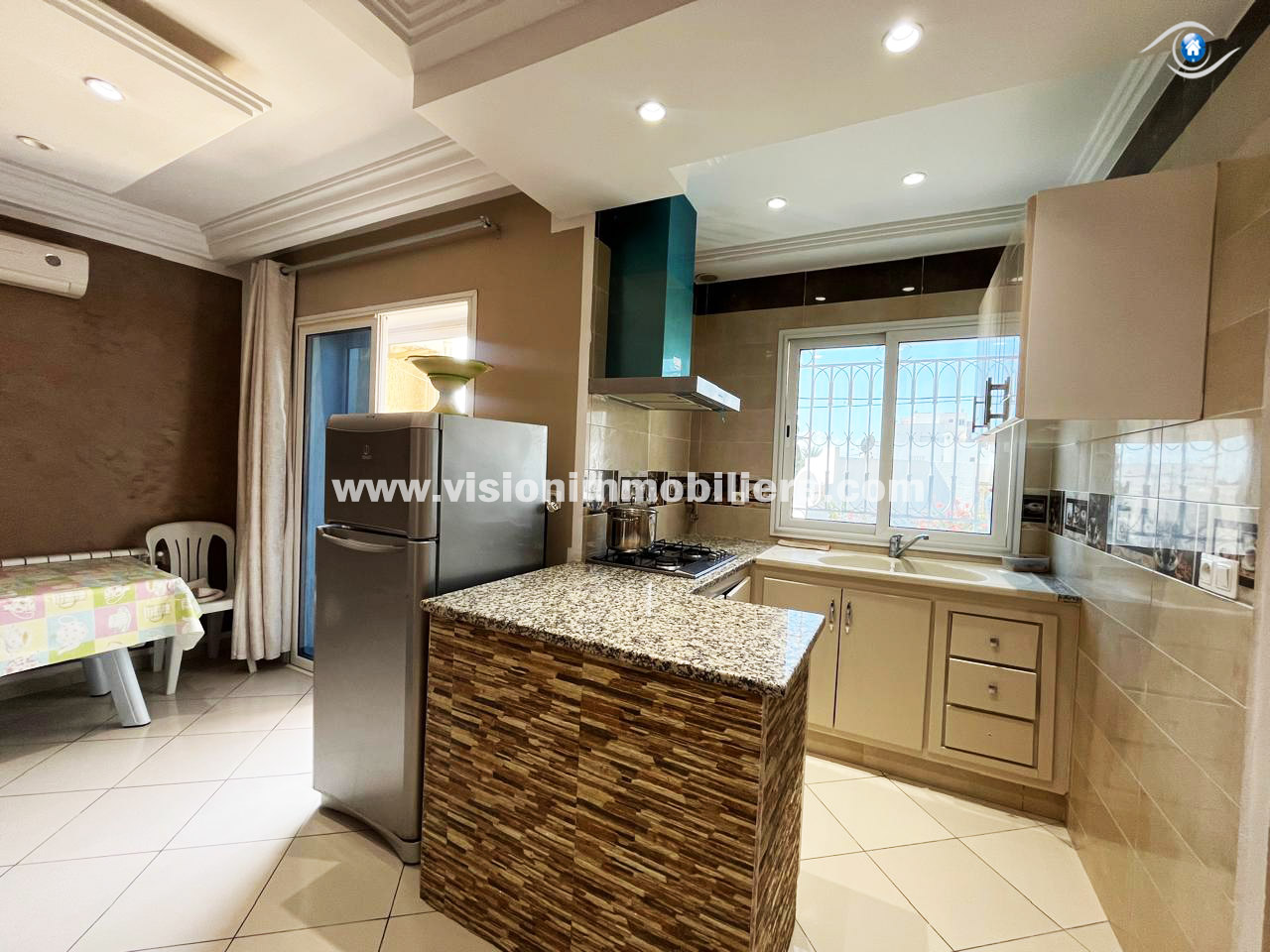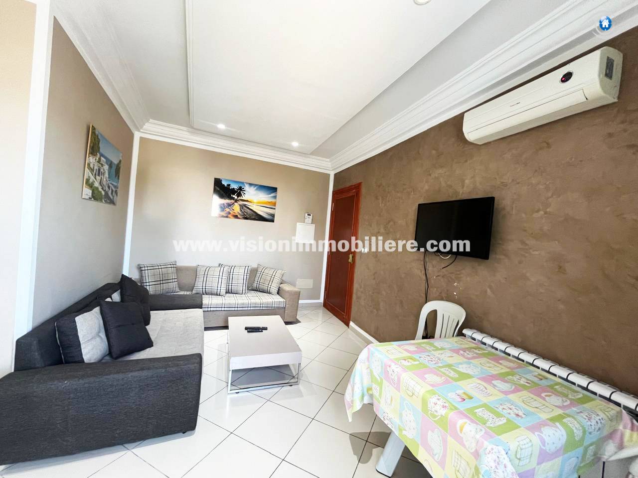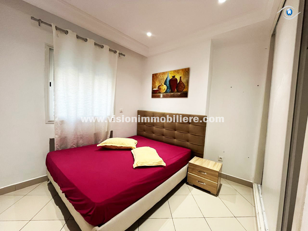 À louer, chez vision-immobilière Hammamet Tunisie, un appartement situé Hammamet centre au 1er étage dans une résidence calme et sécurisé .L’entrée donne sur un salon lumineux et spacieux. La kitchenette agencée est aménagée par les éléments de rangement nécessaire. Le compartiment nuit dispose de deux chambres à coucher et une salle d'eau. L’appartement est entièrement équipé de chauffage central et de climatisation.