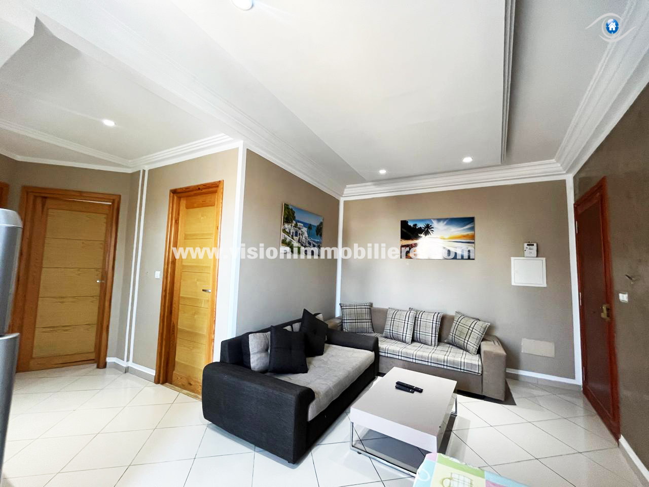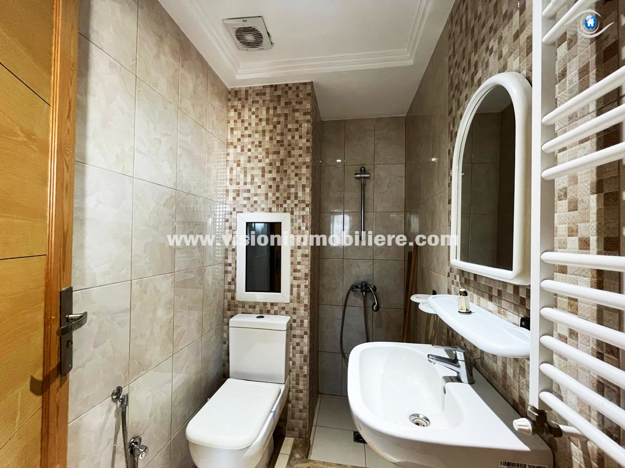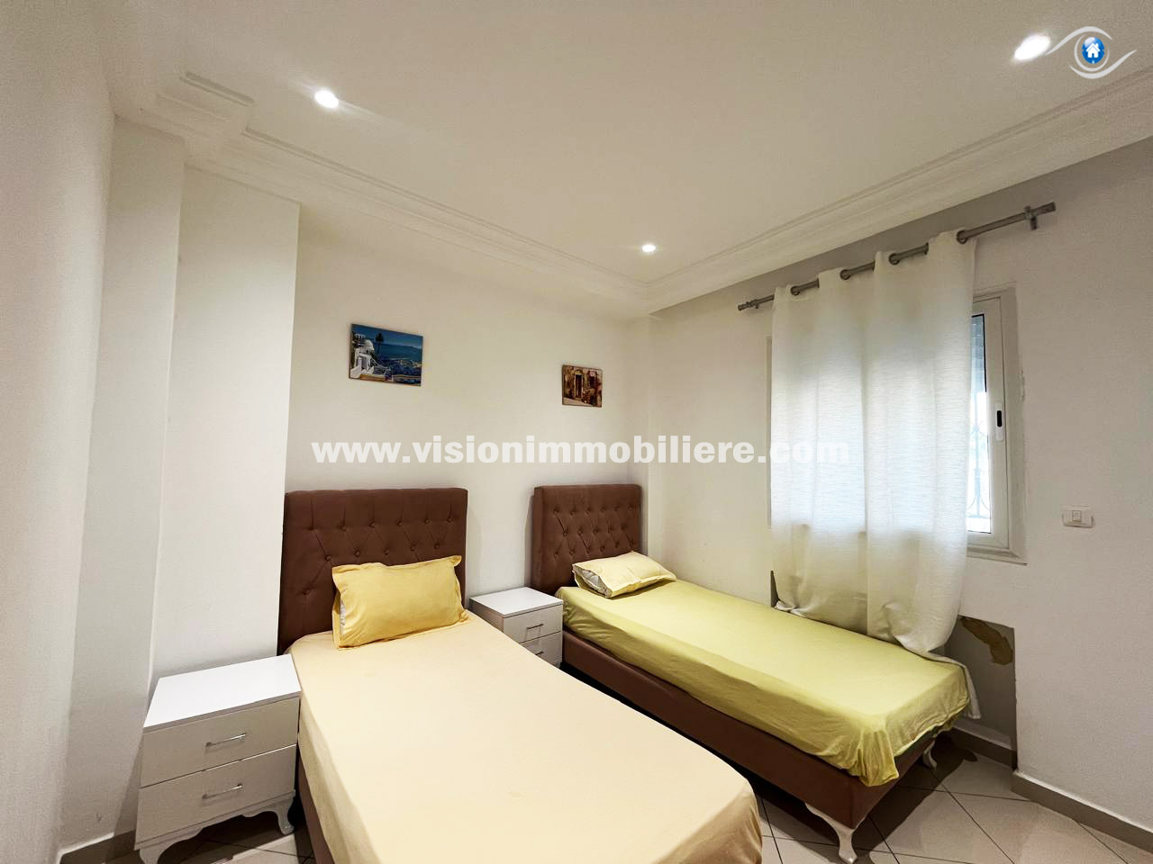 À louer, chez vision-immobilière Hammamet Tunisie, un appartement situé Hammamet centre au 1er étage dans une résidence calme et sécurisé .L’entrée donne sur un salon lumineux et spacieux. La kitchenette agencée est aménagée par les éléments de rangement nécessaire. Le compartiment nuit dispose de deux chambres à coucher et une salle d'eau. L’appartement est entièrement équipé de chauffage central et de climatisation.