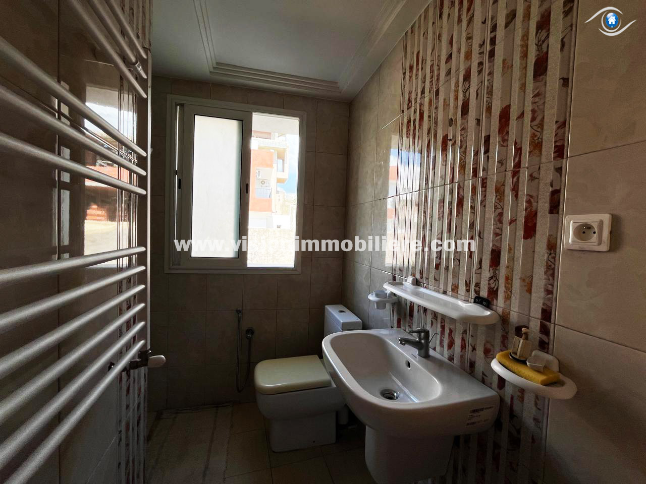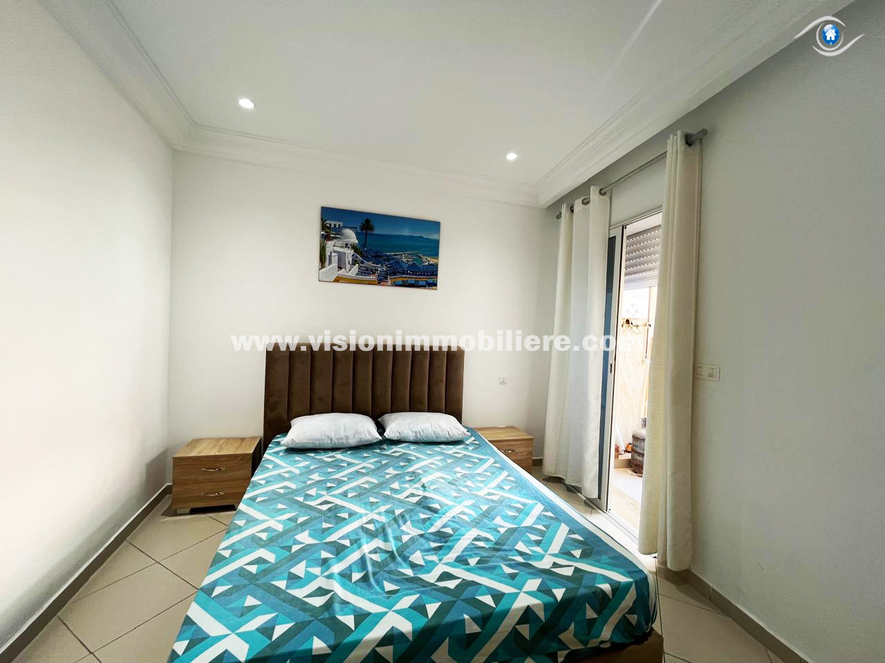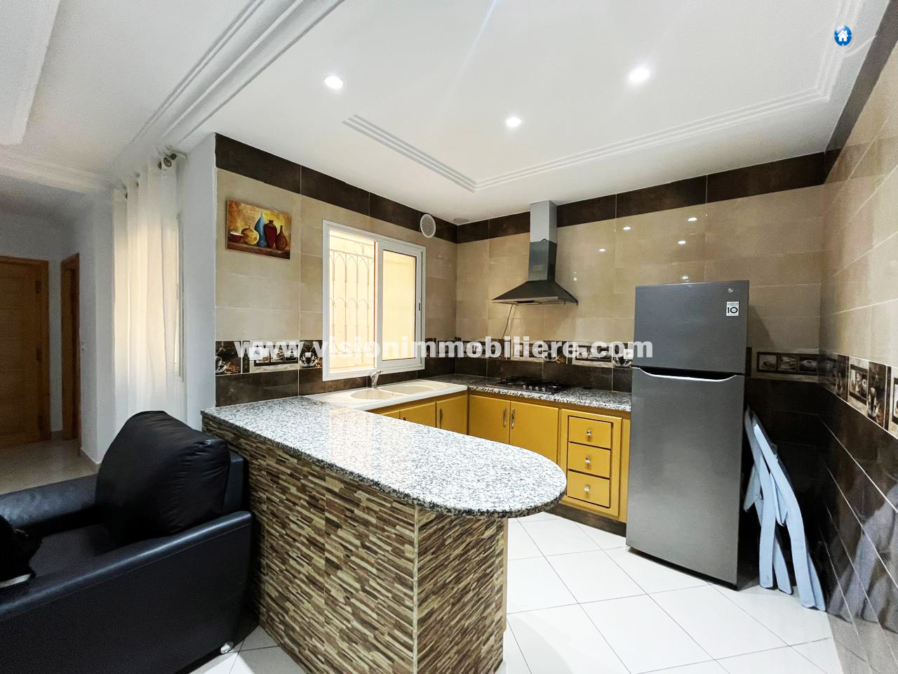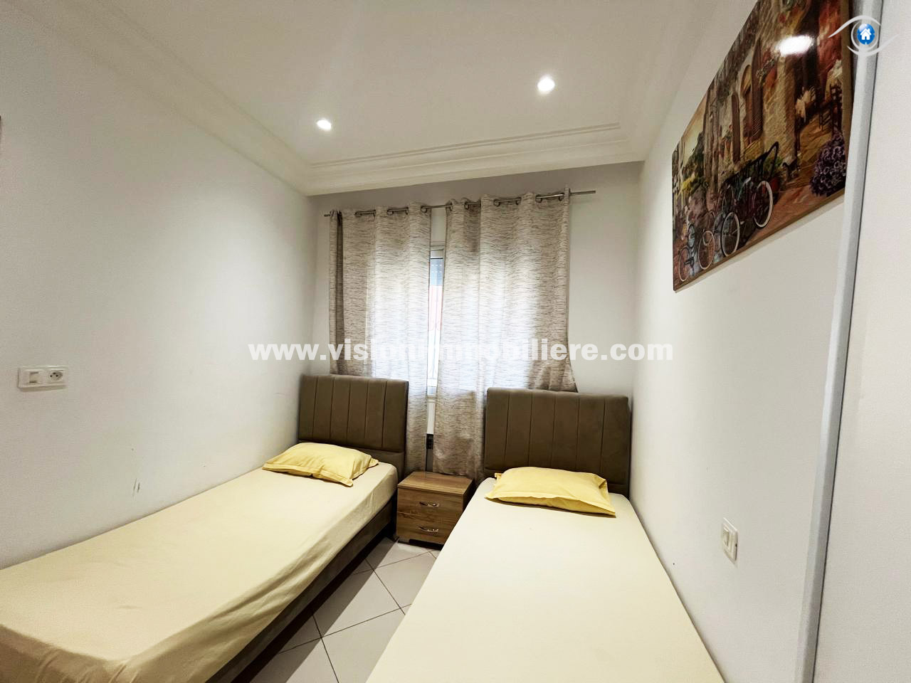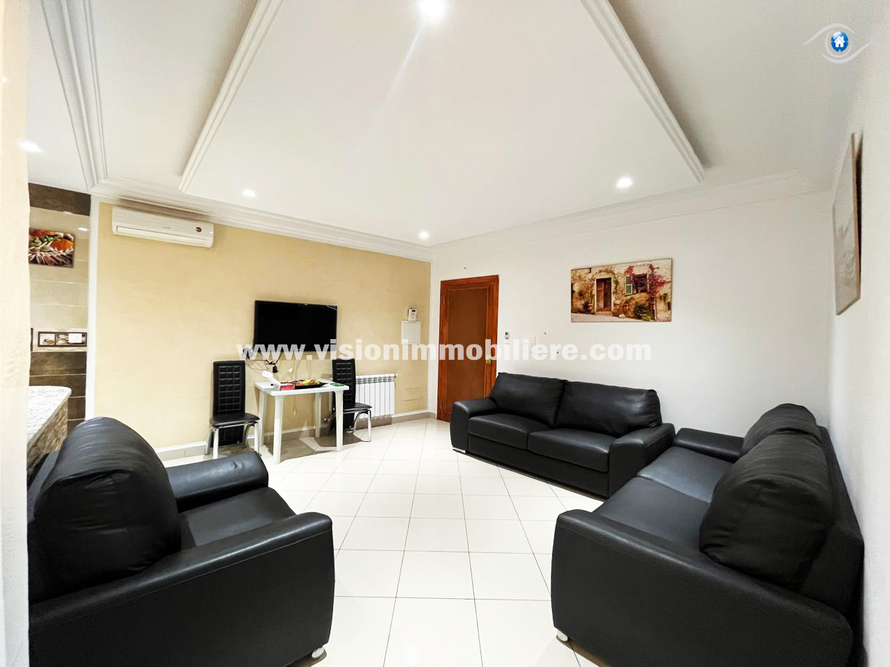 À louer, chez vision-immobilière Hammamet Tunisie, un appartement situé Hammamet centre au 1er étage dans une résidence calme et sécurisé .L’entrée donne sur un salon lumineux et spacieux. La kitchenette agencée est aménagée par les éléments de rangement nécessaire. Le compartiment nuit dispose de deux chambres à coucher et une salle d'eau. L’appartement est entièrement équipé de chauffage central et de climatisation.