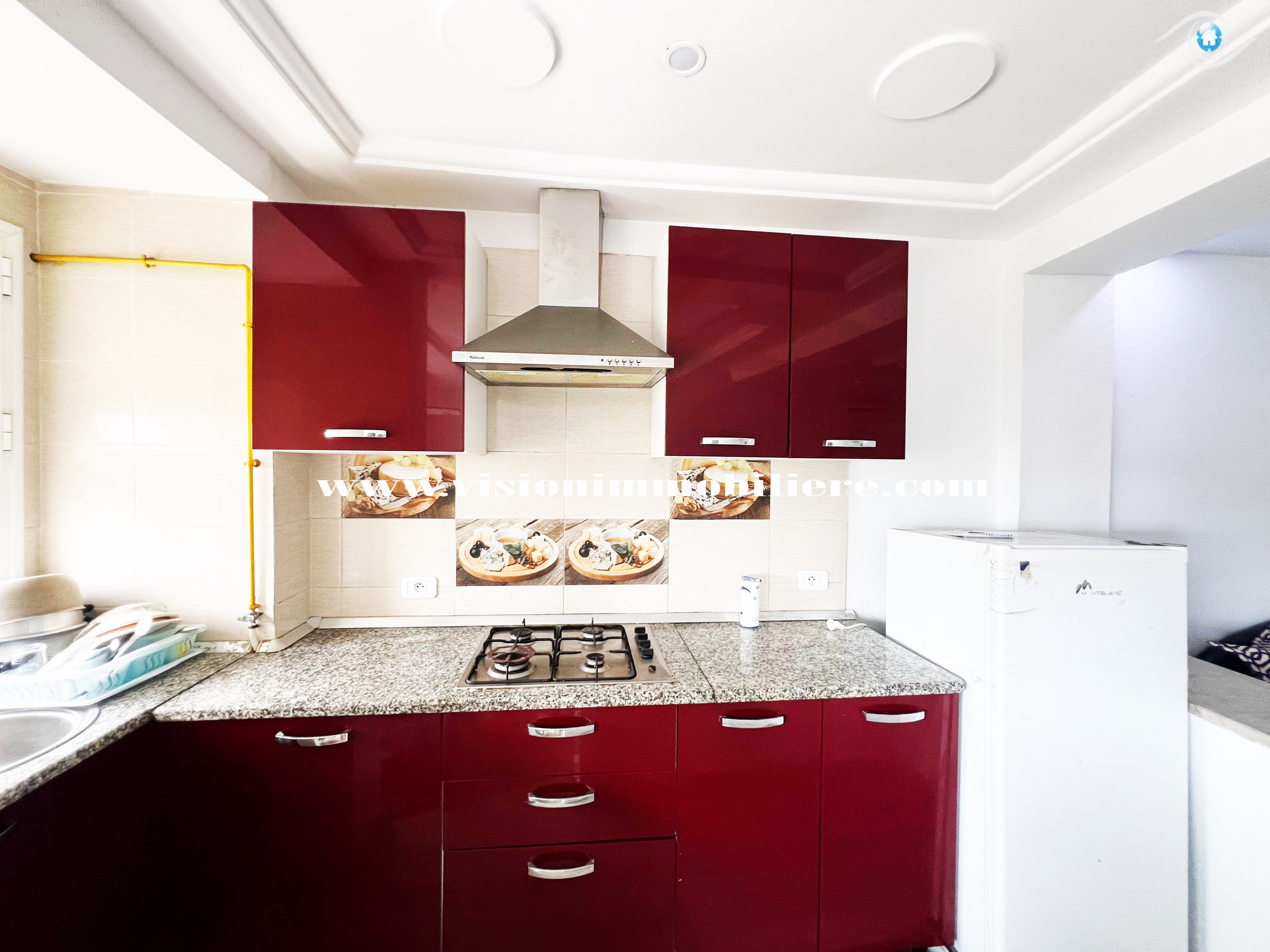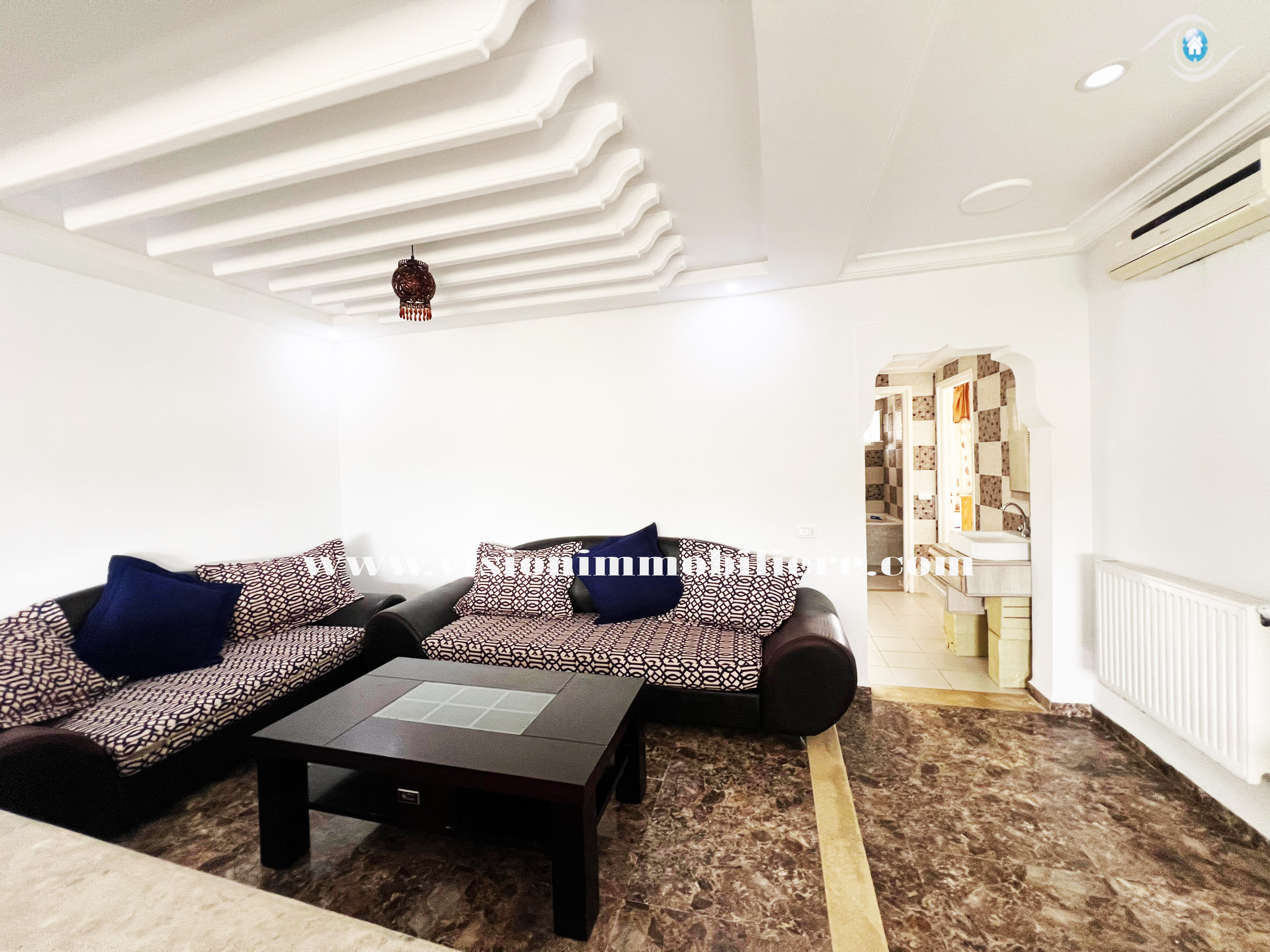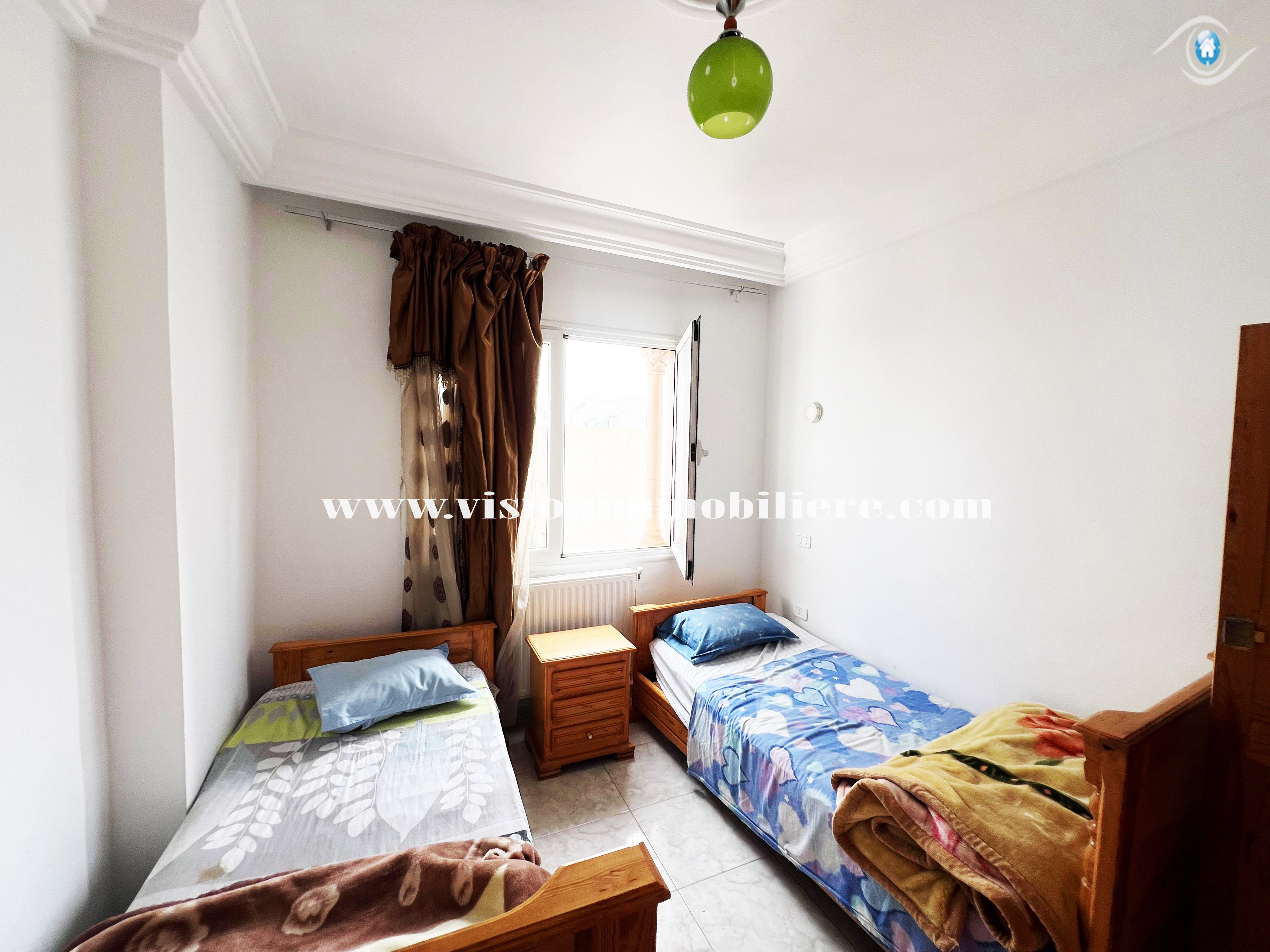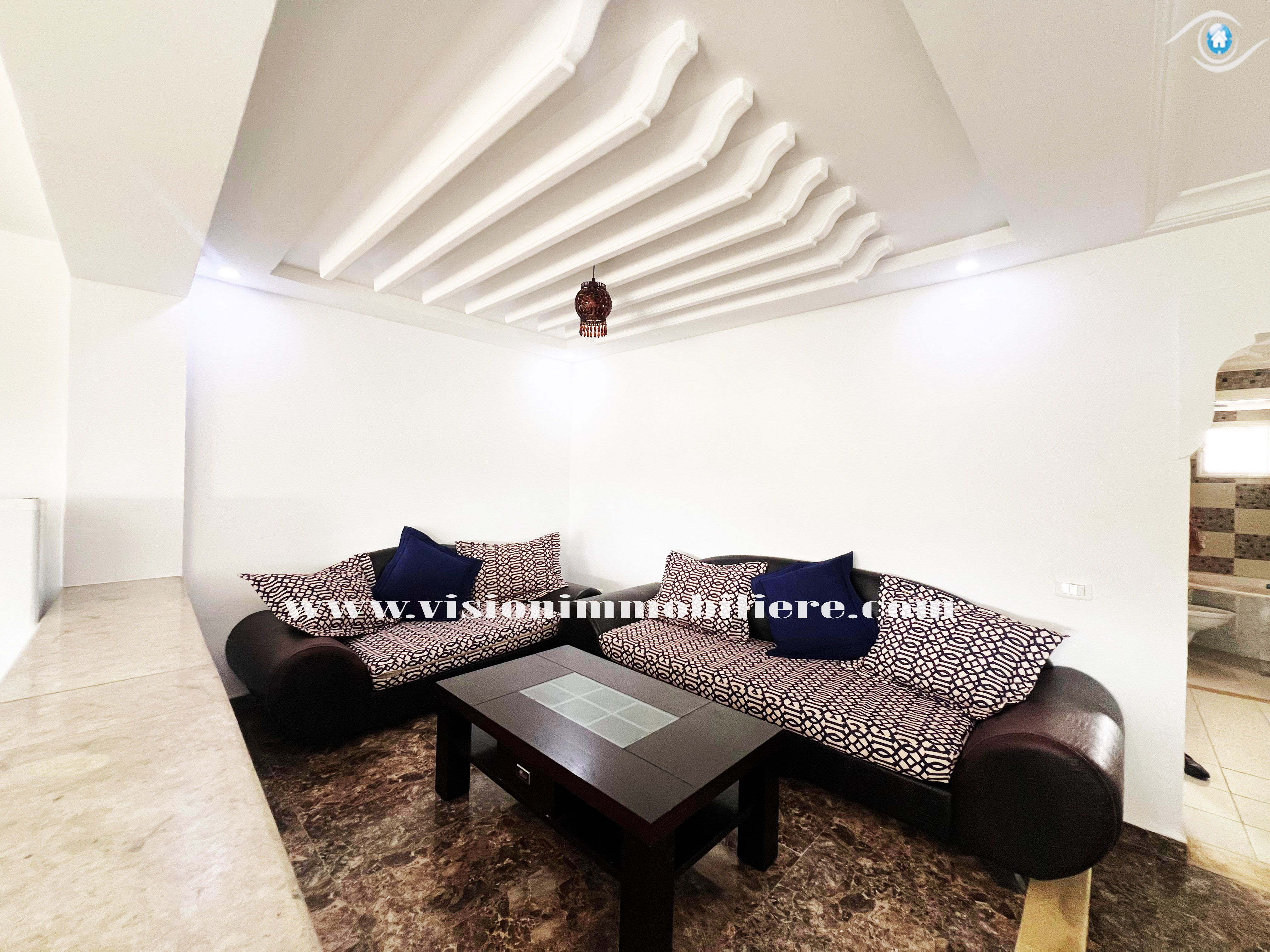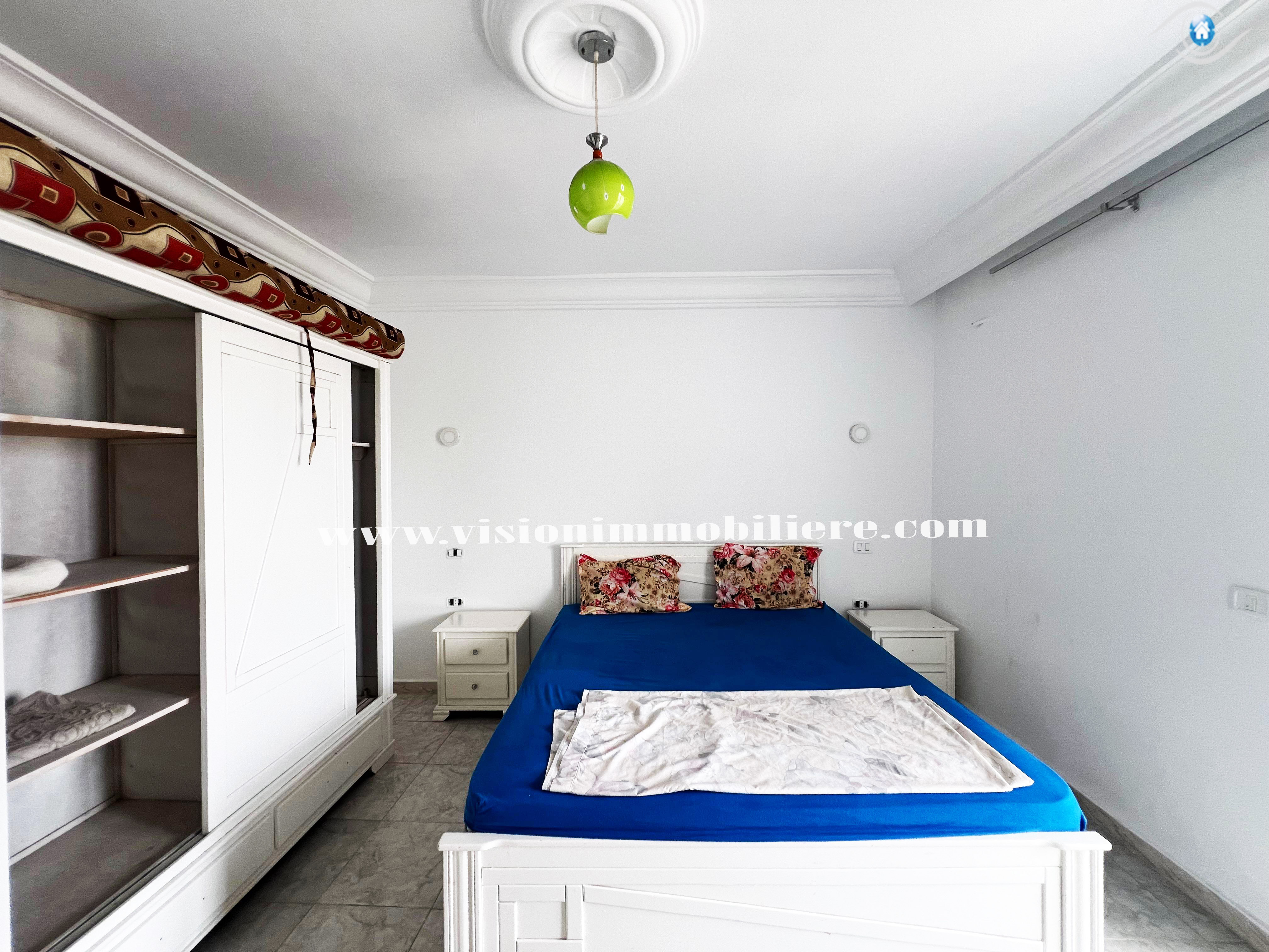 A louer , chez Vision Immobilière Hammamet Tunisie , Cet appartement est situé à Hammamet Centre . L’entrée donne sur un salon lumineux qui ouvre sur un balcon qui offre une vue panoramique. une kitchenette est agencée et équipée d’une plaque de cuisson et des éléments de rangements . La partie nuit est composée de deux chambres à coucher chacune équipée par son propre dressing . Elles se partagent une salle de bain commune .