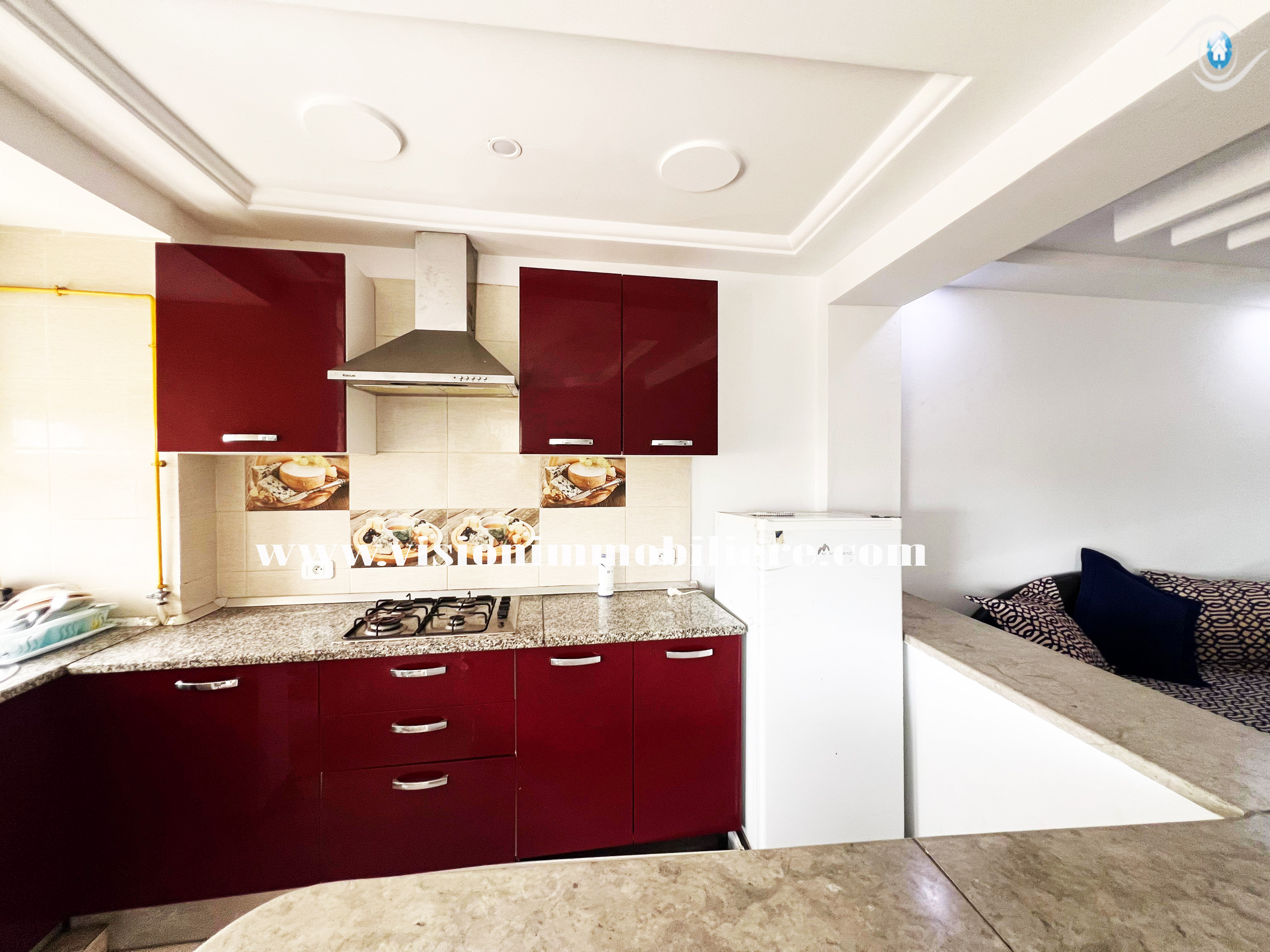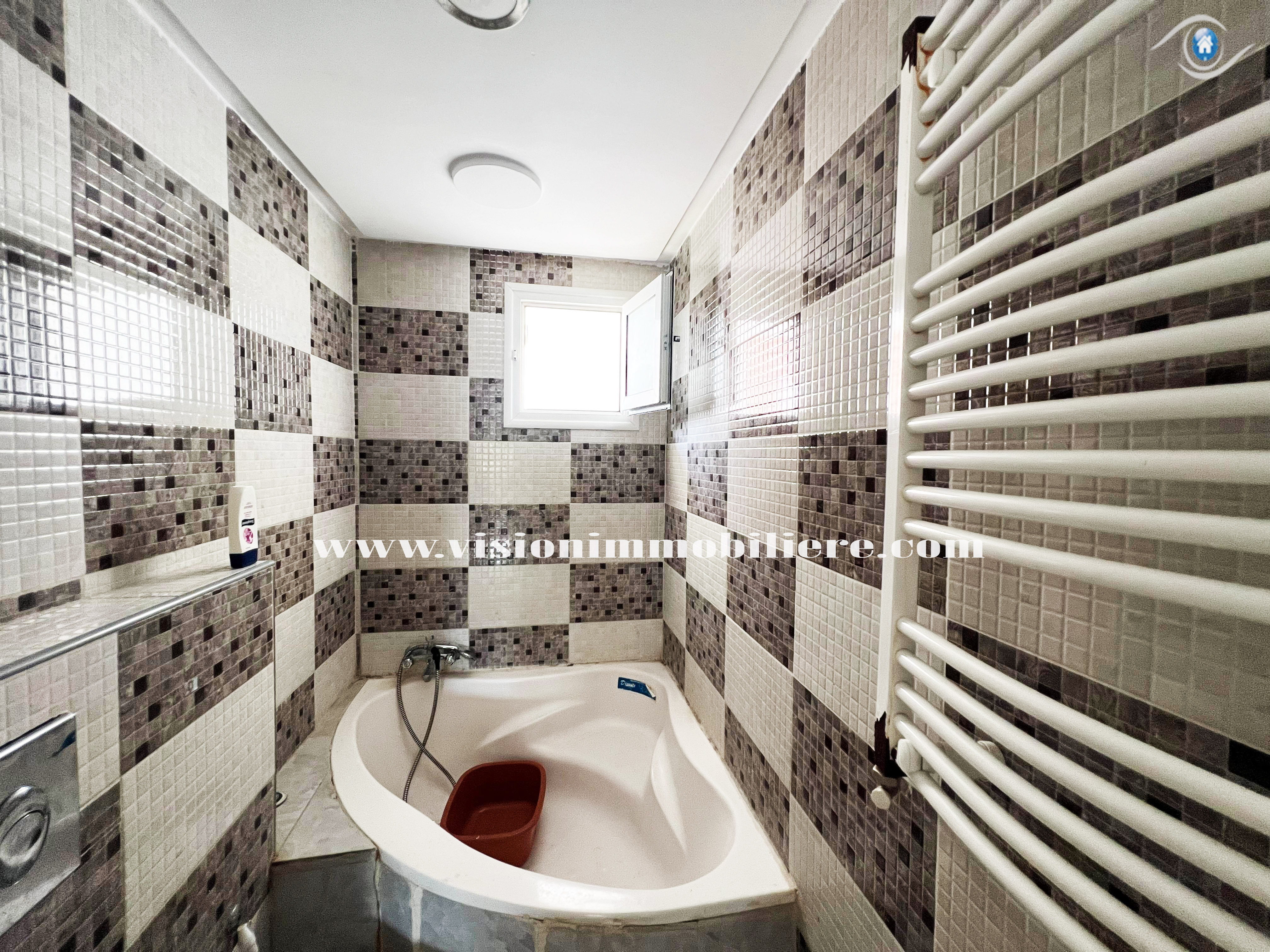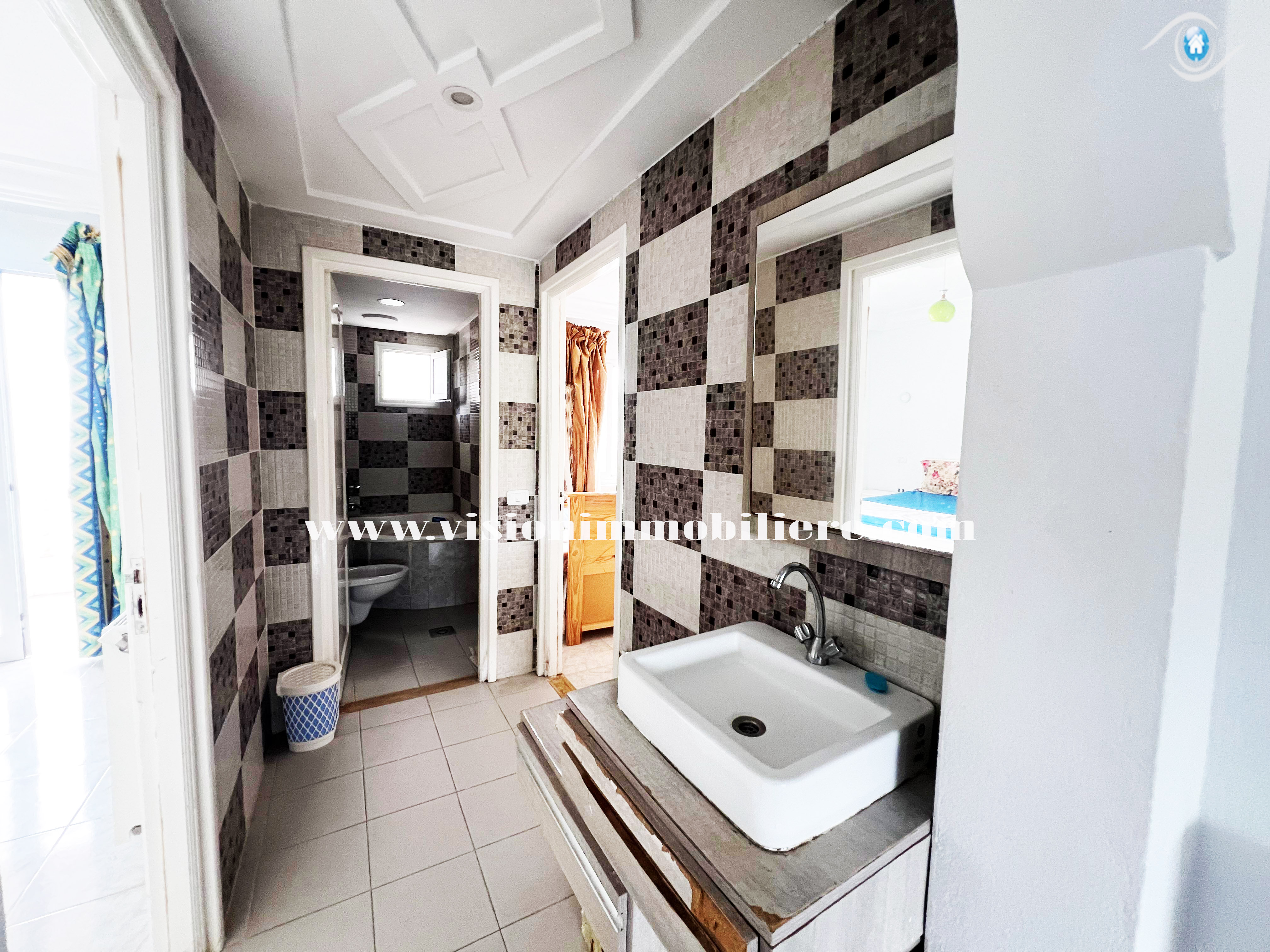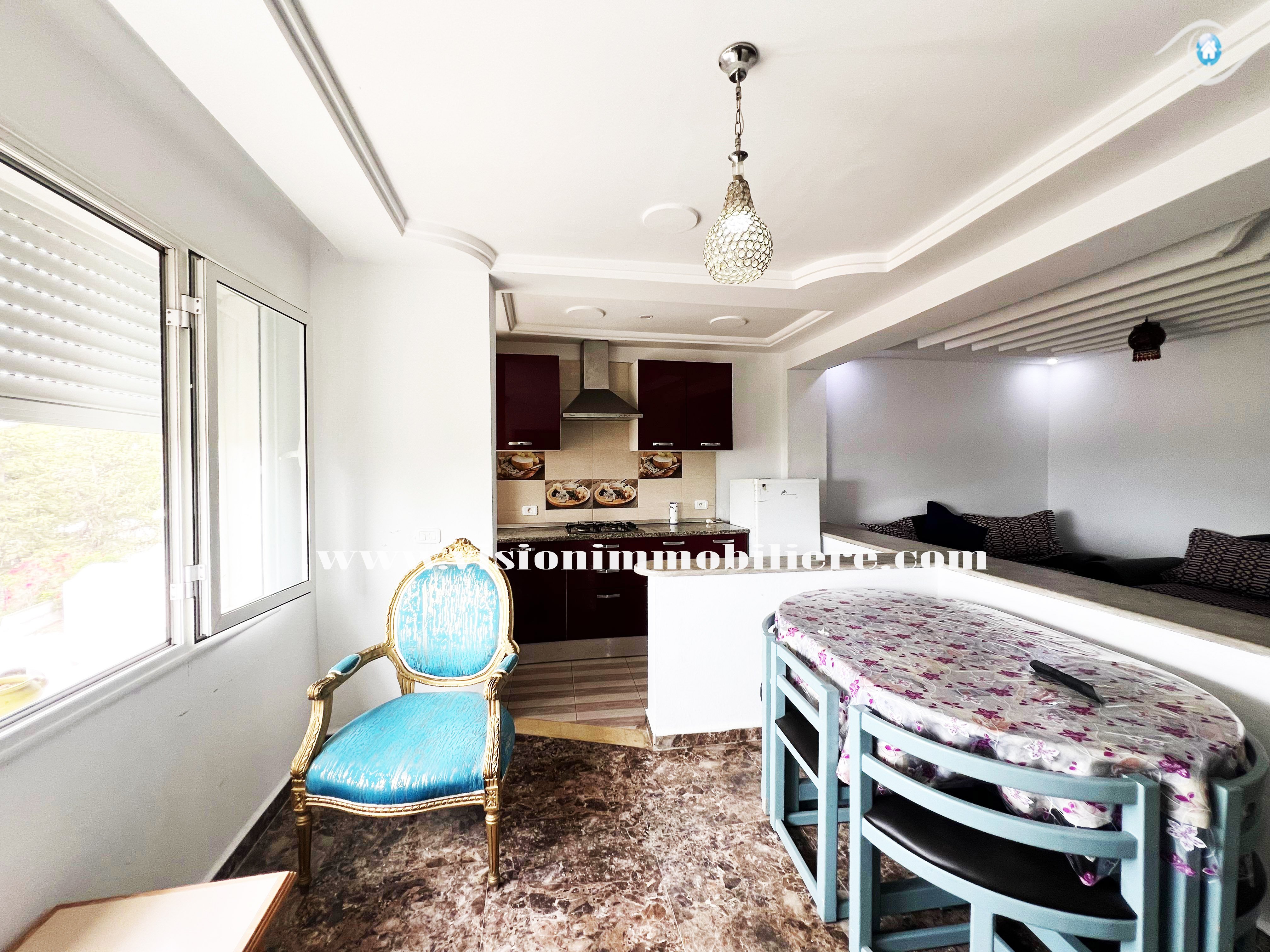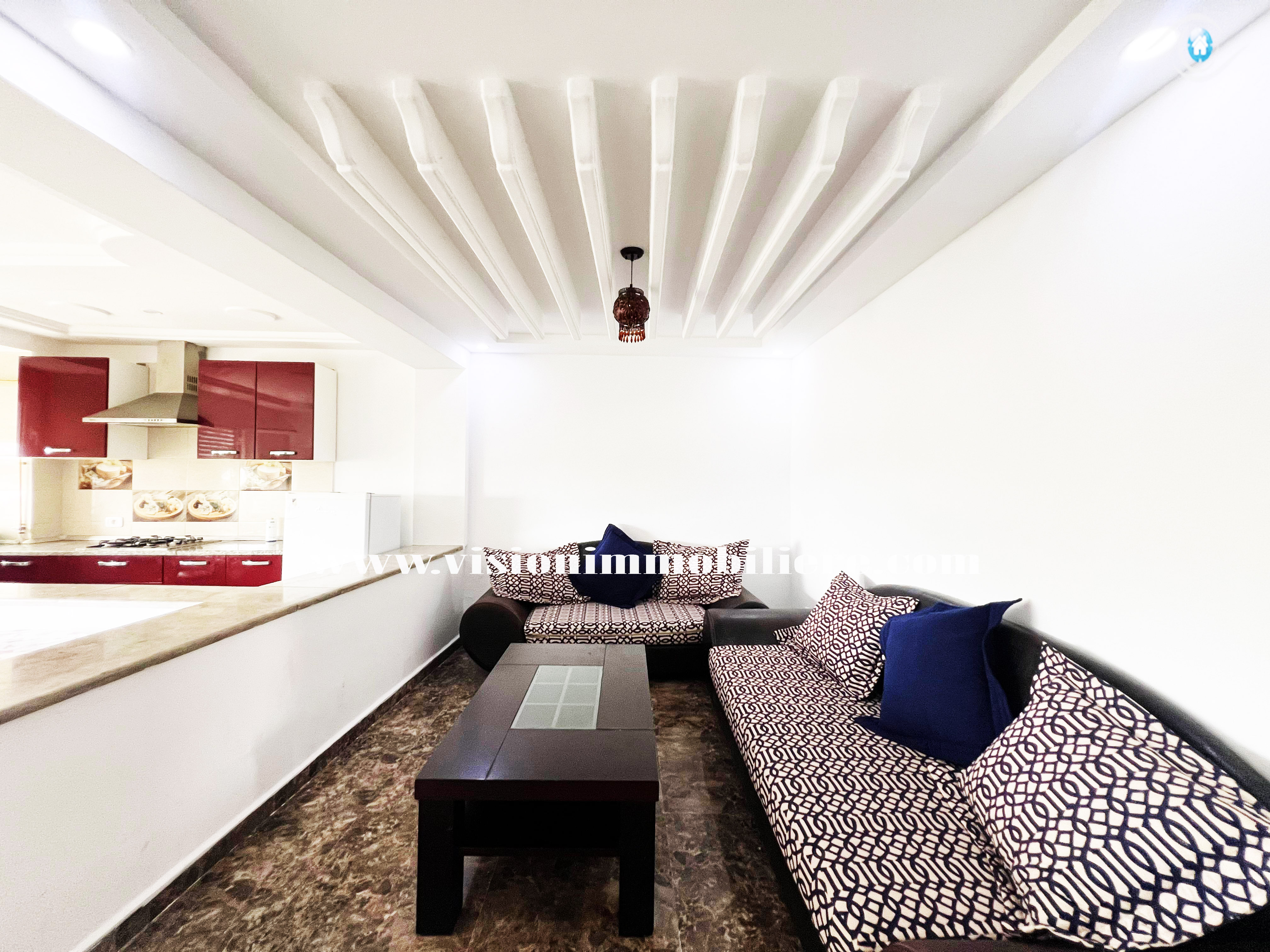A louer , chez Vision Immobilière Hammamet Tunisie , Cet appartement est situé à Hammamet Centre . L’entrée donne sur un salon lumineux qui ouvre sur un balcon qui offre une vue panoramique. une kitchenette est agencée et équipée d’une plaque de cuisson et des éléments de rangements . La partie nuit est composée de deux chambres à coucher chacune équipée par son propre dressing . Elles se partagent une salle de bain commune .
