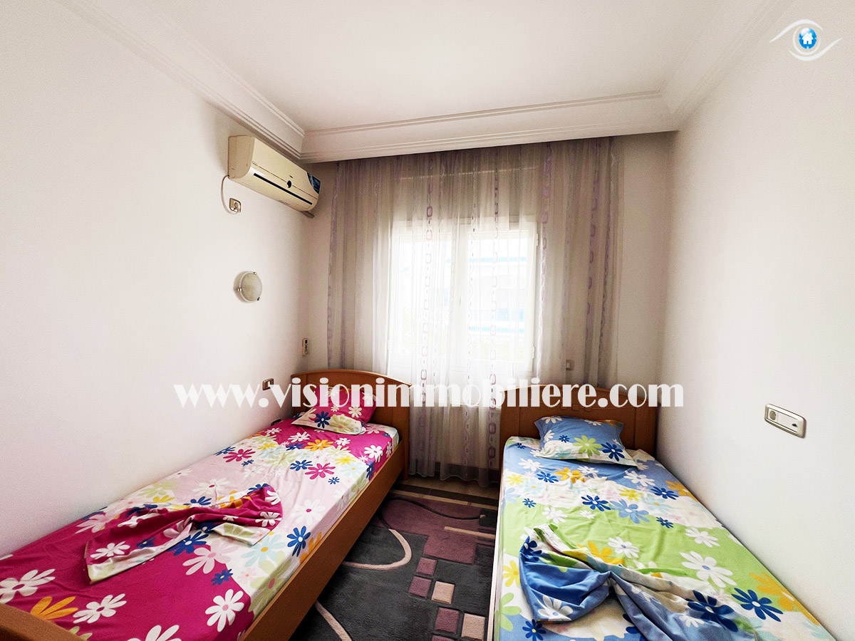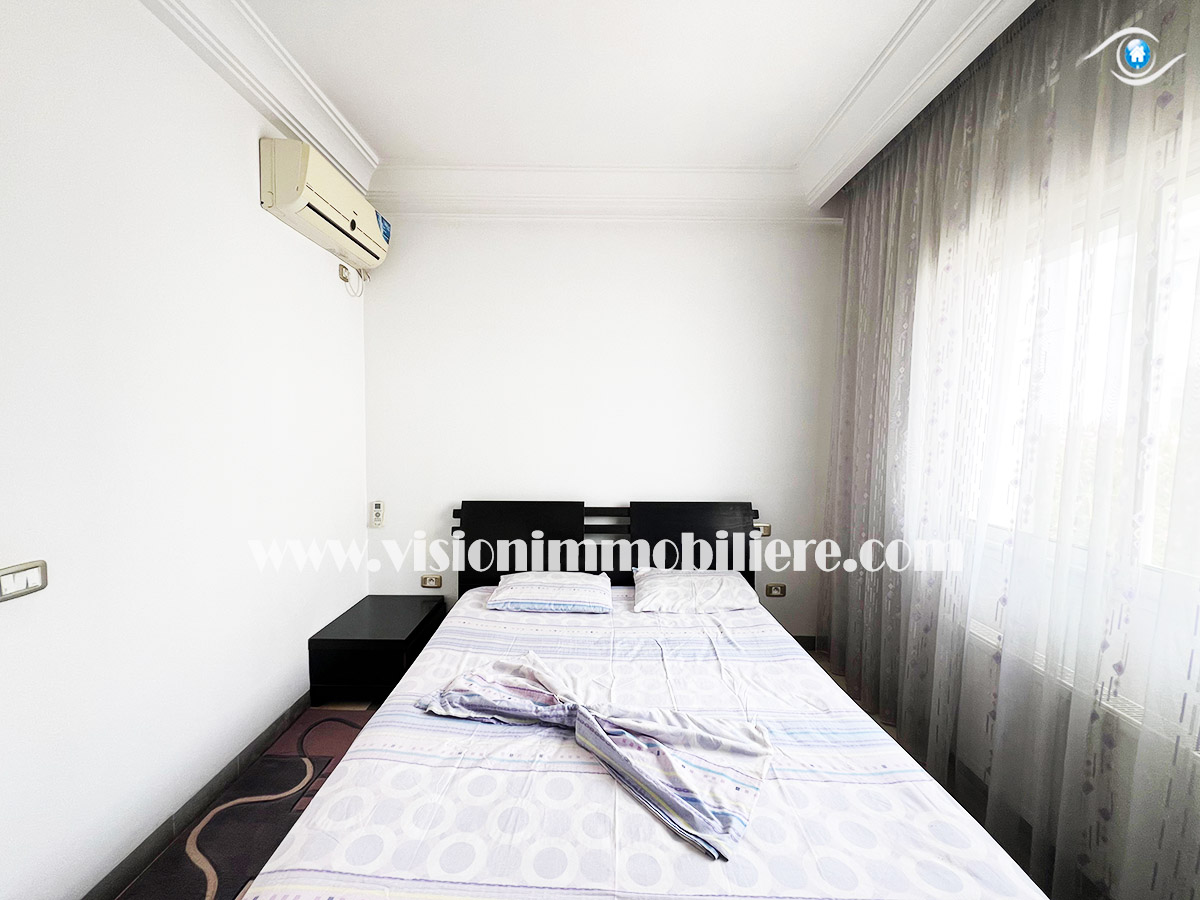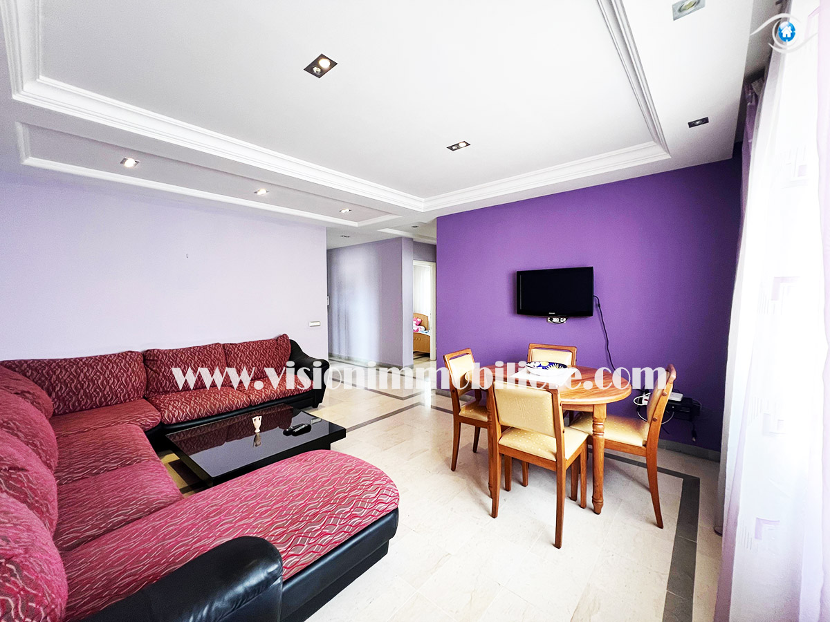A louer à l’année chez vision-immobilière Hammamet Tunisie, un appartement situé au 1 er étage à Hammamet-centre. L’entrée donne sur un salon. La cuisine agencée est aménagée par les éléments de rangement nécessaire. Le compartiment nuit dispose deux chambres à coucher. Elles se partagent une salle d'eau. L’appartement est entièrement équipé de chauffage central et de climatisations. Un abri pour voiture.