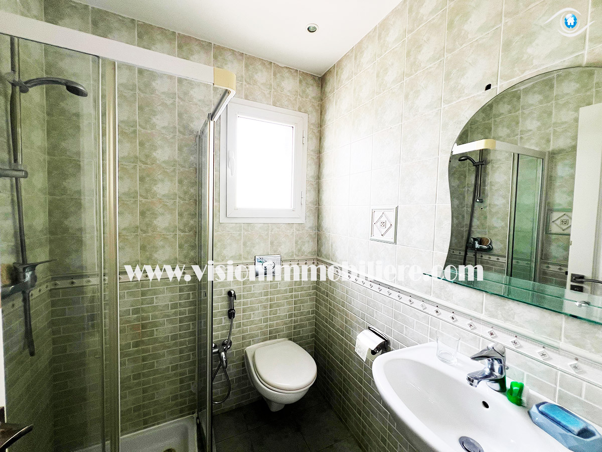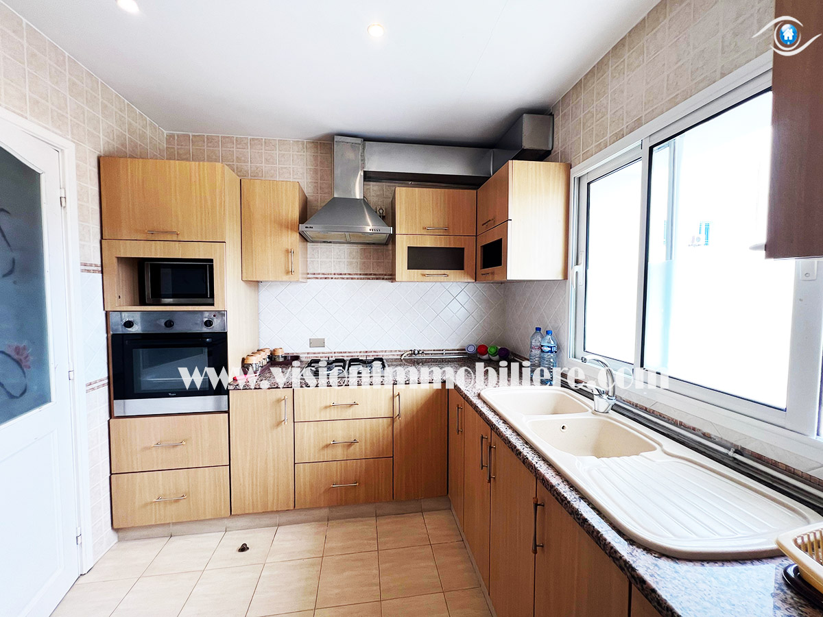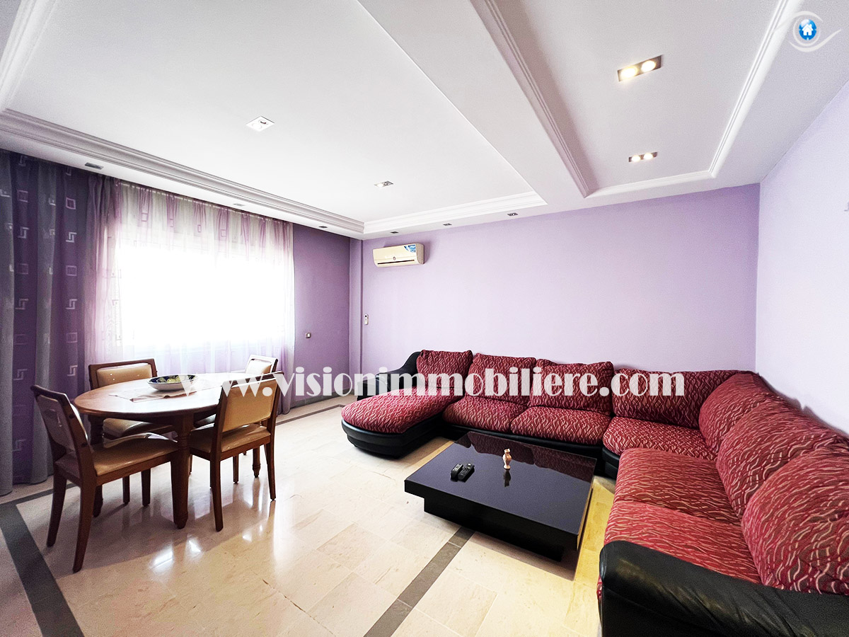 A louer à l’année chez vision-immobilière Hammamet Tunisie, un appartement situé au 1 er étage à Hammamet-centre. L’entrée donne sur un salon. La cuisine agencée est aménagée par les éléments de rangement nécessaire. Le compartiment nuit dispose deux chambres à coucher. Elles se partagent une salle d'eau. L’appartement est entièrement équipé de chauffage central et de climatisations. Un abri pour voiture.