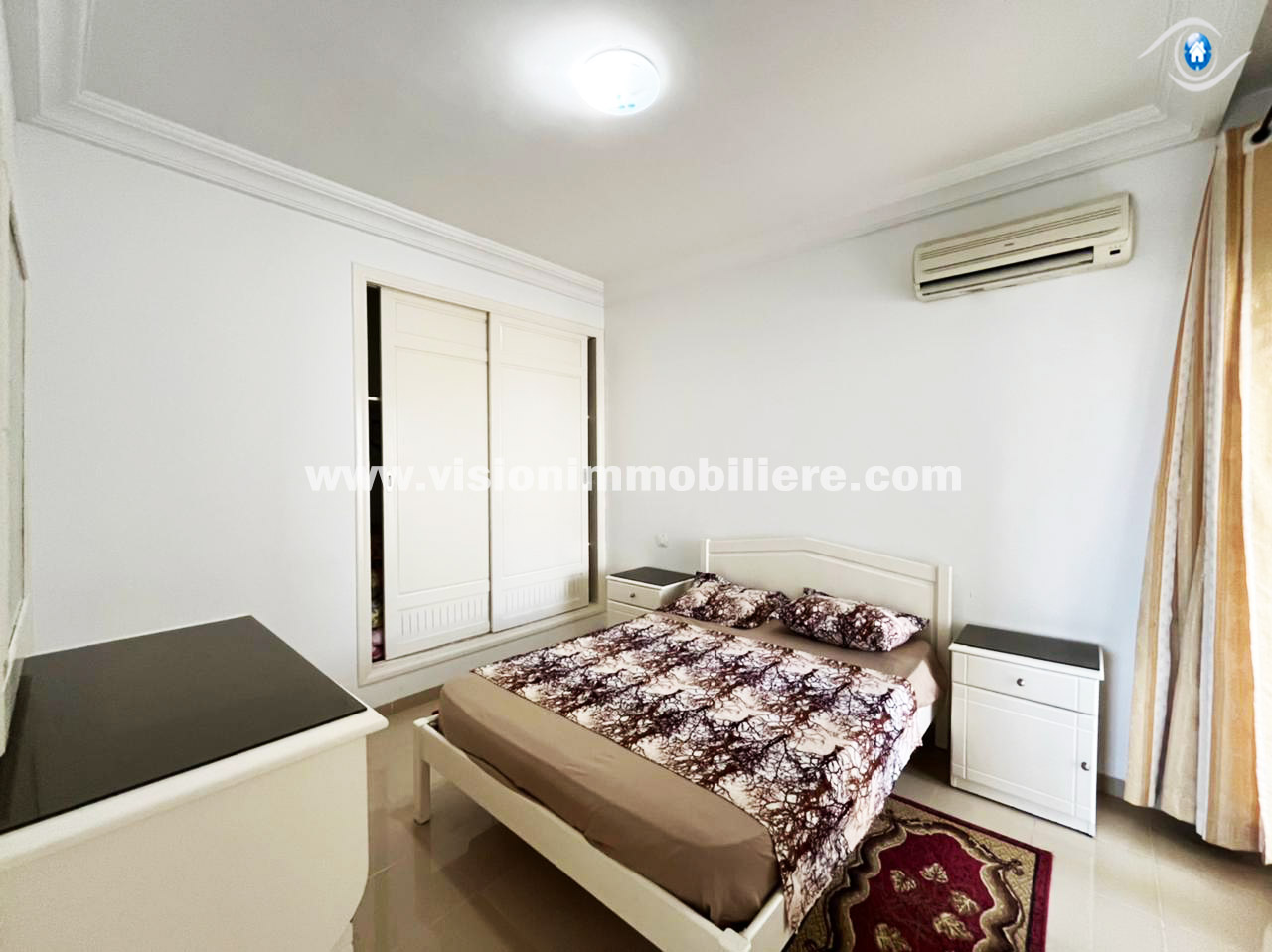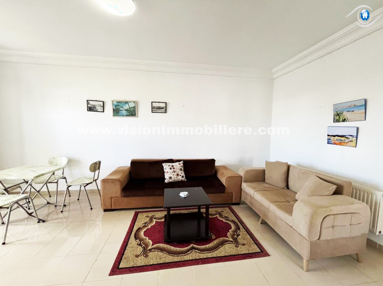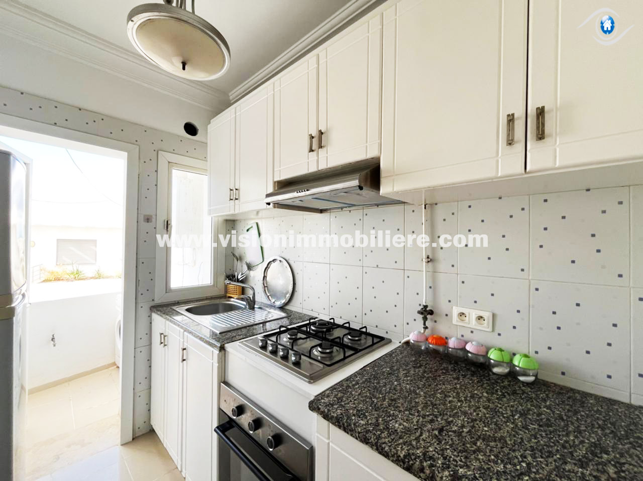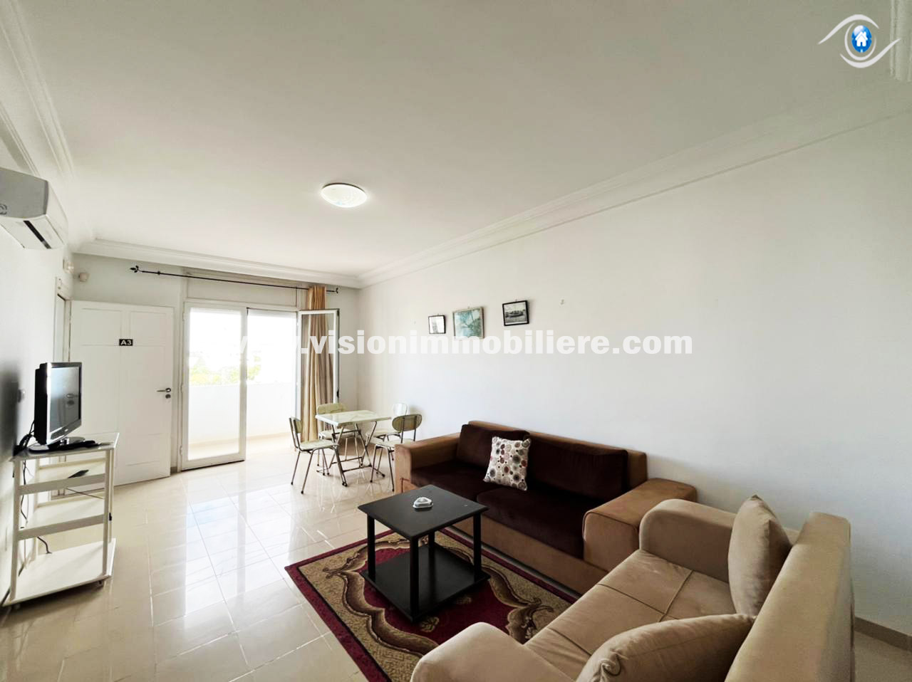À louer, chez vision-immobilière Hammamet Tunisie, un appartement situé Hammamet centre au 2ème étage dans un immeuble calme et sécurisé. L’entrée donne sur un salon lumineux et spacieux qui s'ouvre sur une terrasse. La cuisine agencée est aménagée par les éléments de rangement nécessaire qui s'ouvre aussi sur une terrasse. Le compartiment nuit dispose d'une chambre à coucher et une salle d'eau. L’appartement est entièrement équipé de chauffage central et de climatisations. Place de parking disponible.