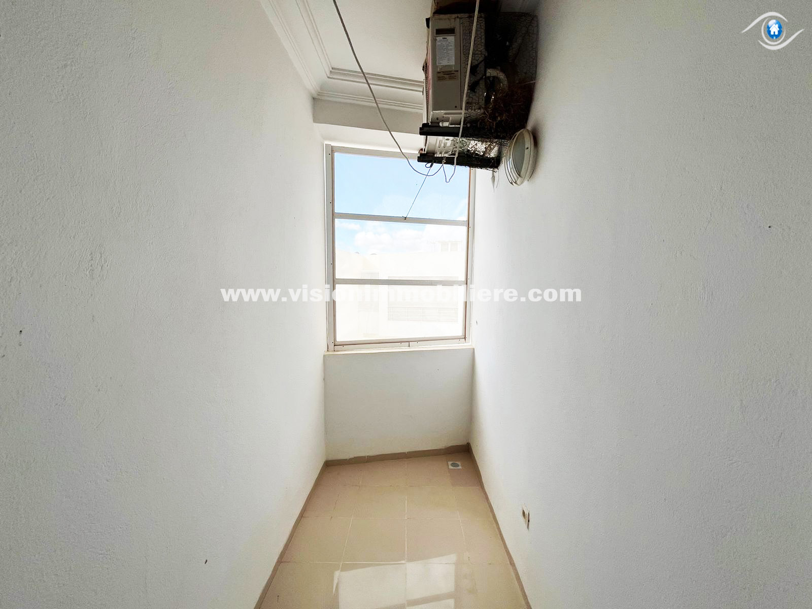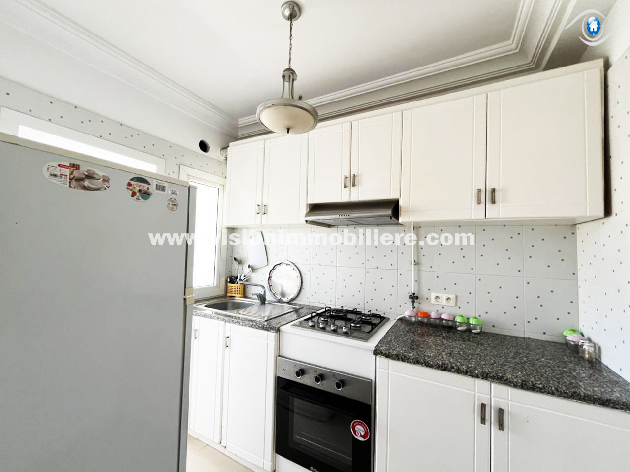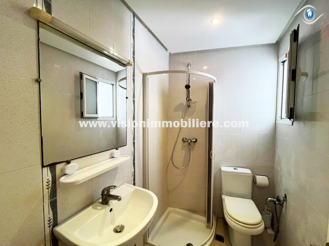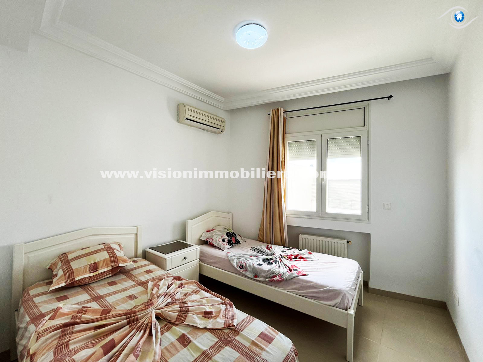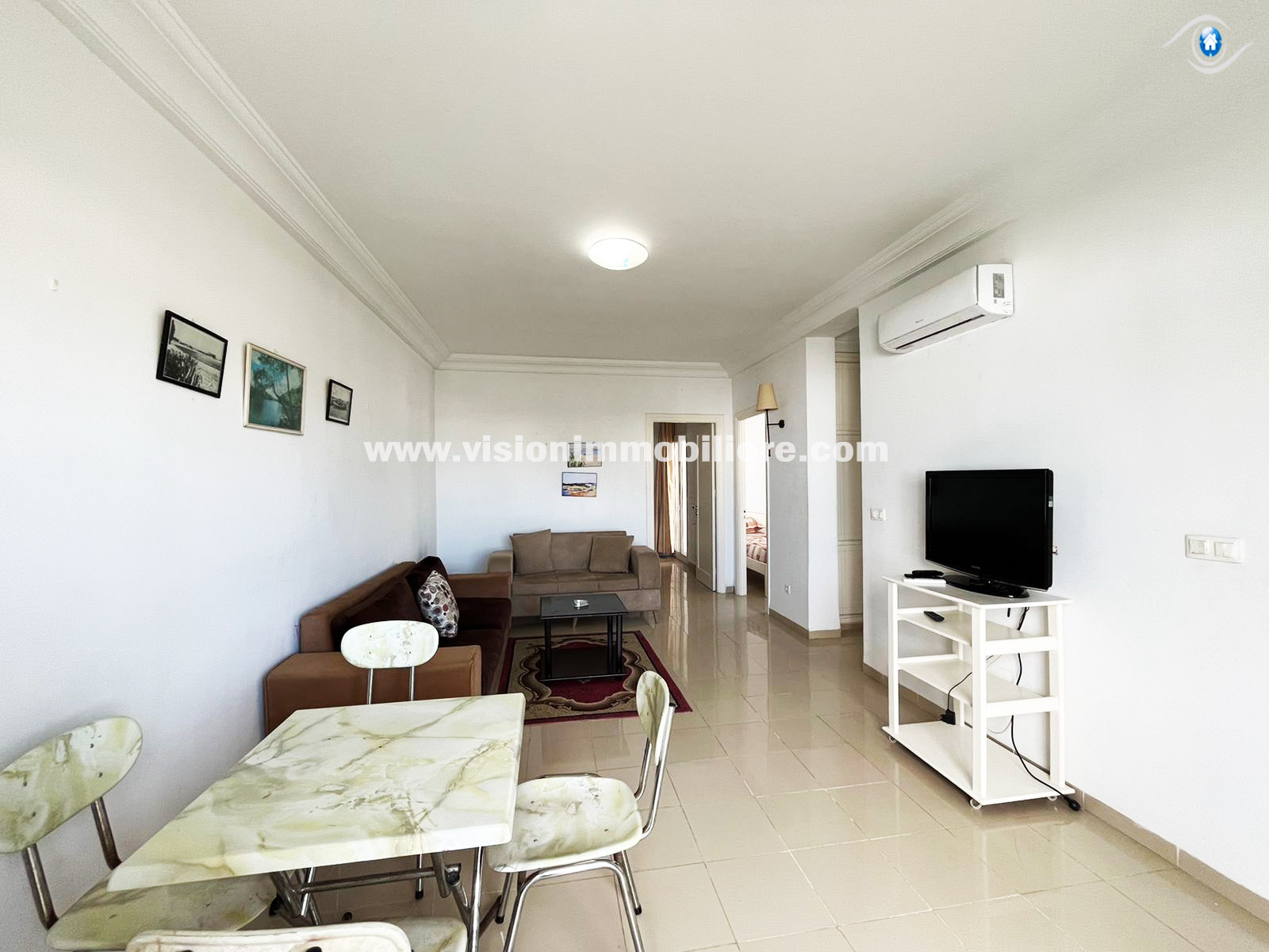 À louer, chez vision-immobilière Hammamet Tunisie, un appartement situé Hammamet centre au 2ème étage dans un immeuble calme et sécurisé. L’entrée donne sur un salon lumineux et spacieux qui s'ouvre sur une terrasse. La cuisine agencée est aménagée par les éléments de rangement nécessaire qui s'ouvre aussi sur une terrasse. Le compartiment nuit dispose d'une chambre à coucher et une salle d'eau. L’appartement est entièrement équipé de chauffage central et de climatisations. Place de parking disponible.