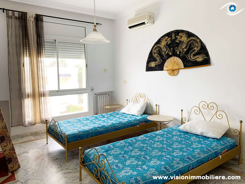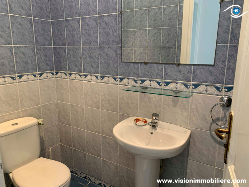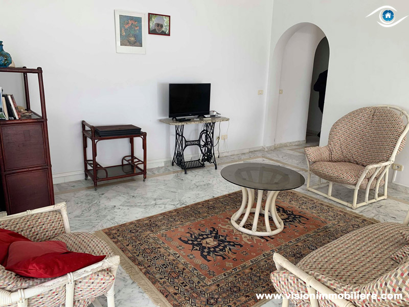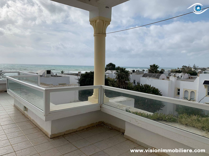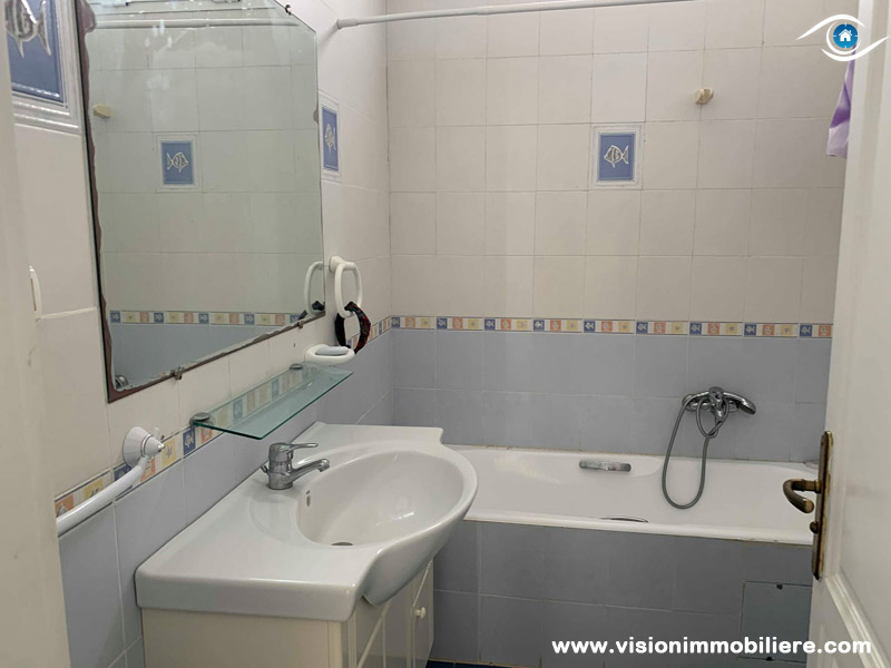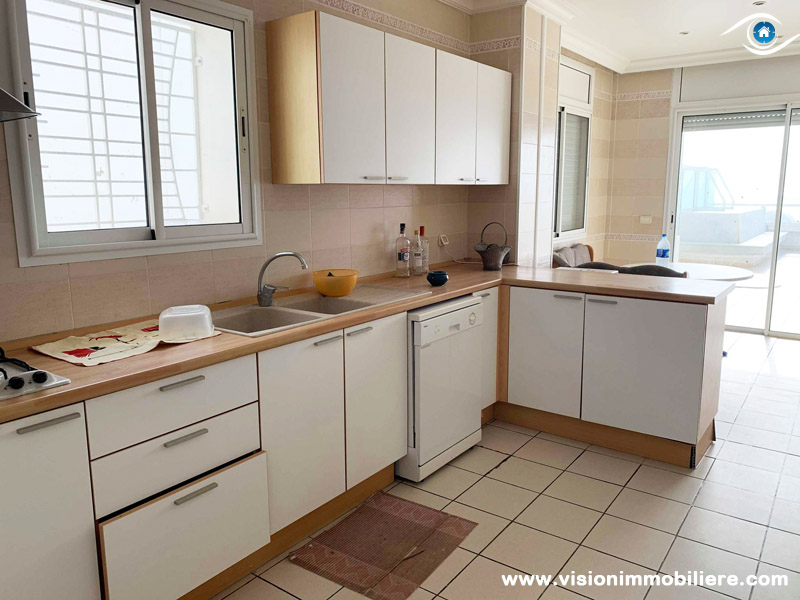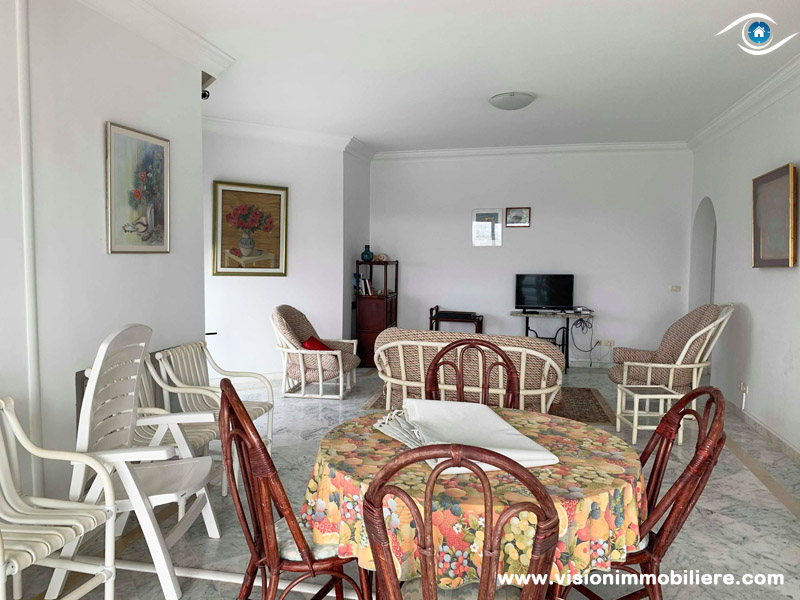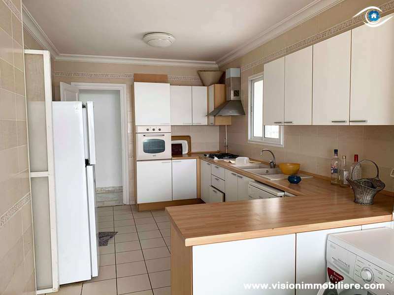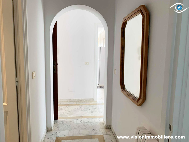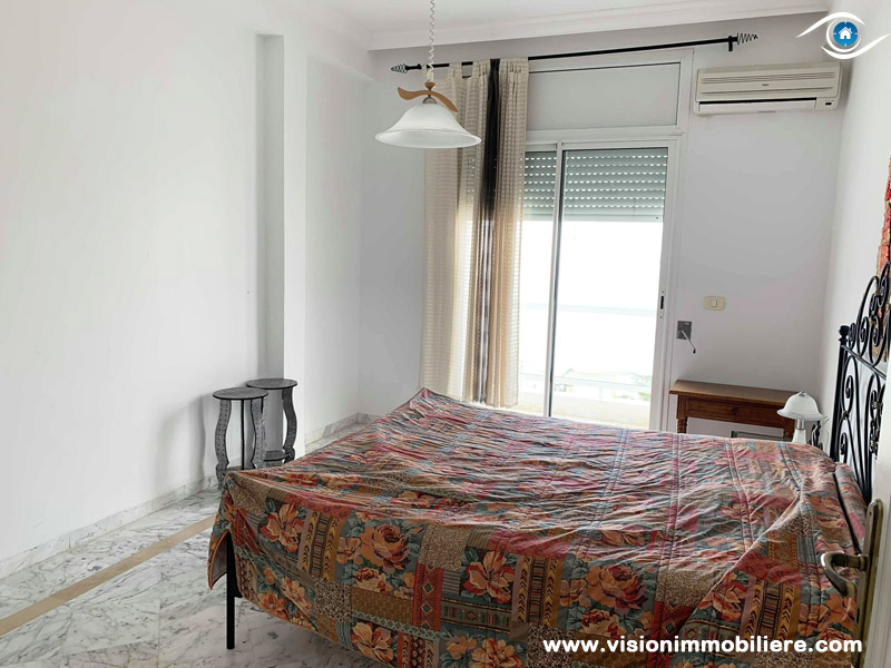 A louer, Chez Vision Immobiliére , Cet appartement est situé à Hammamet Centre , au deuxième étage offre une vue panoramique sur mer d’une résidence gardée et bien entretenue pied dans l’eau. Le hall d’entrée donne sur la pièce principale possédé une salon et salle à manger. Ainsi qu’une cuisine bien équipée et aménagée par les éléments de rangement nécessaire (plaque de cuisson, d'une hotte aspirante et d'un four encastré), et une salle d’eau pour les invités. Le compartiment nuit loge deux chambres à coucher chacune avec son propre dressing qui se partagent une salle de bain commune. Une place de parking au sous-sol est disponible .