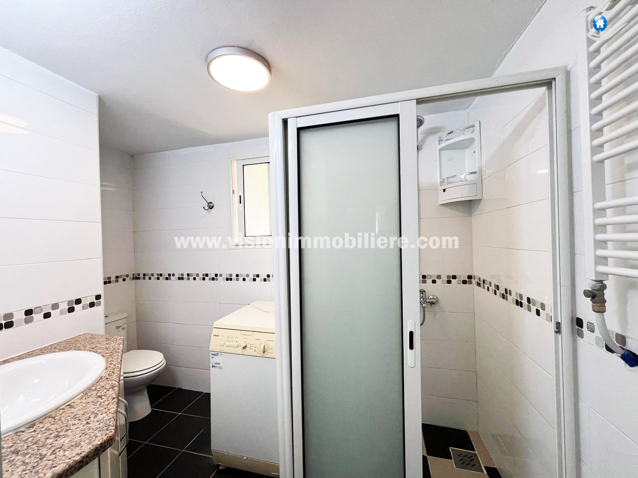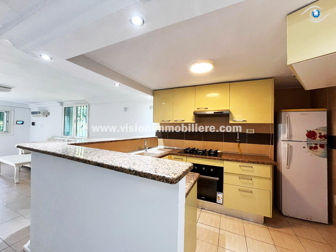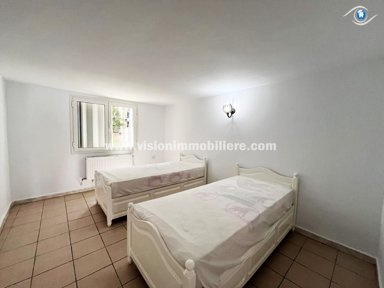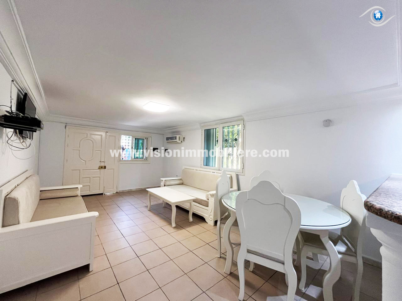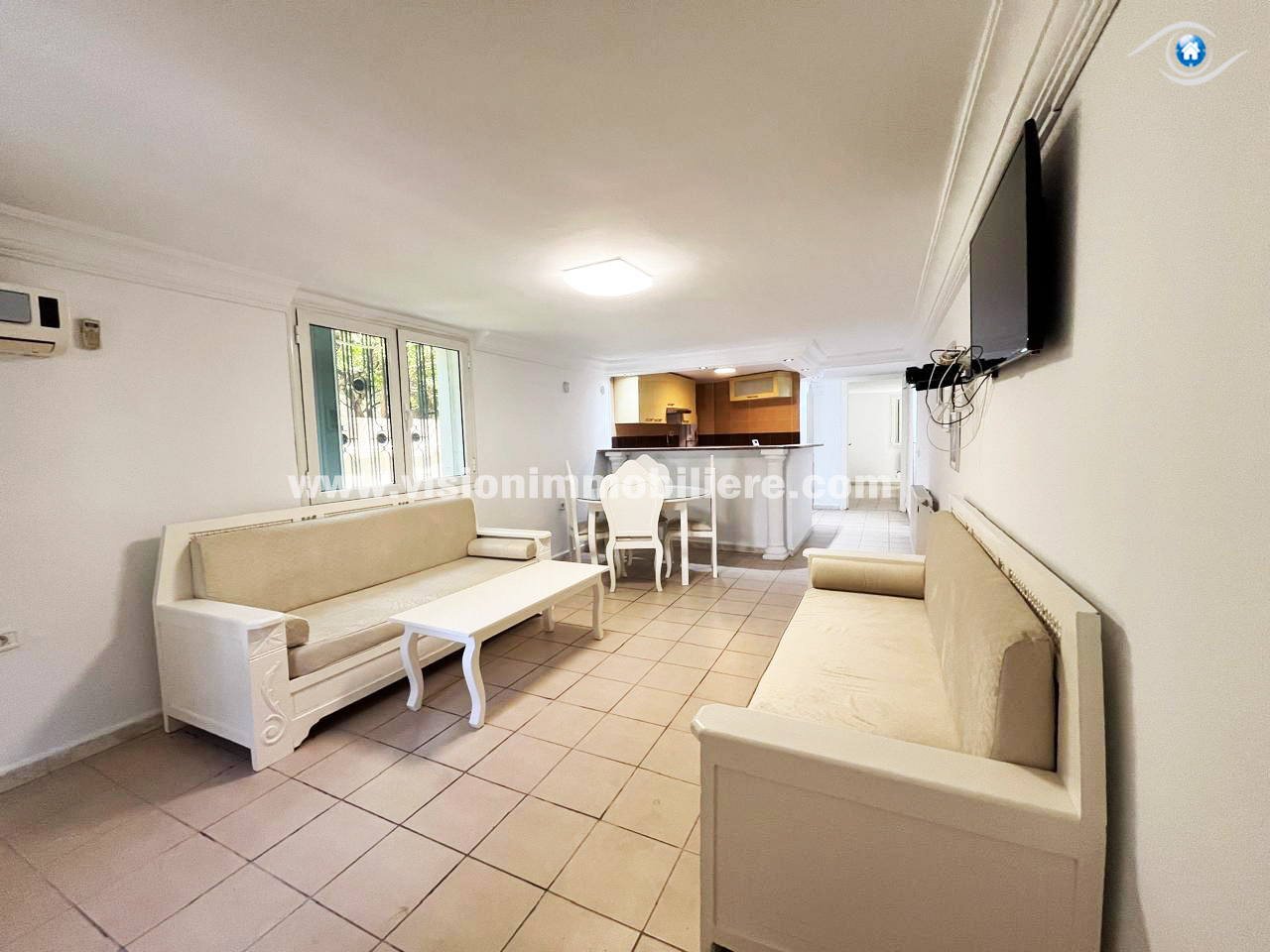À louer, chez vision-immobilière Hammamet Tunisie, un appartement situé a Hammamet Nord au RDC. L’entrée donne sur un salon lumineux et spacieux et une kitchinette aménagée par les éléments de rangement nécessaire. Le compartiment nuit dispose de deux chambres à coucher et une salle d'eau. L’appartement est entièrement équipé de chauffage central et de climatisations .